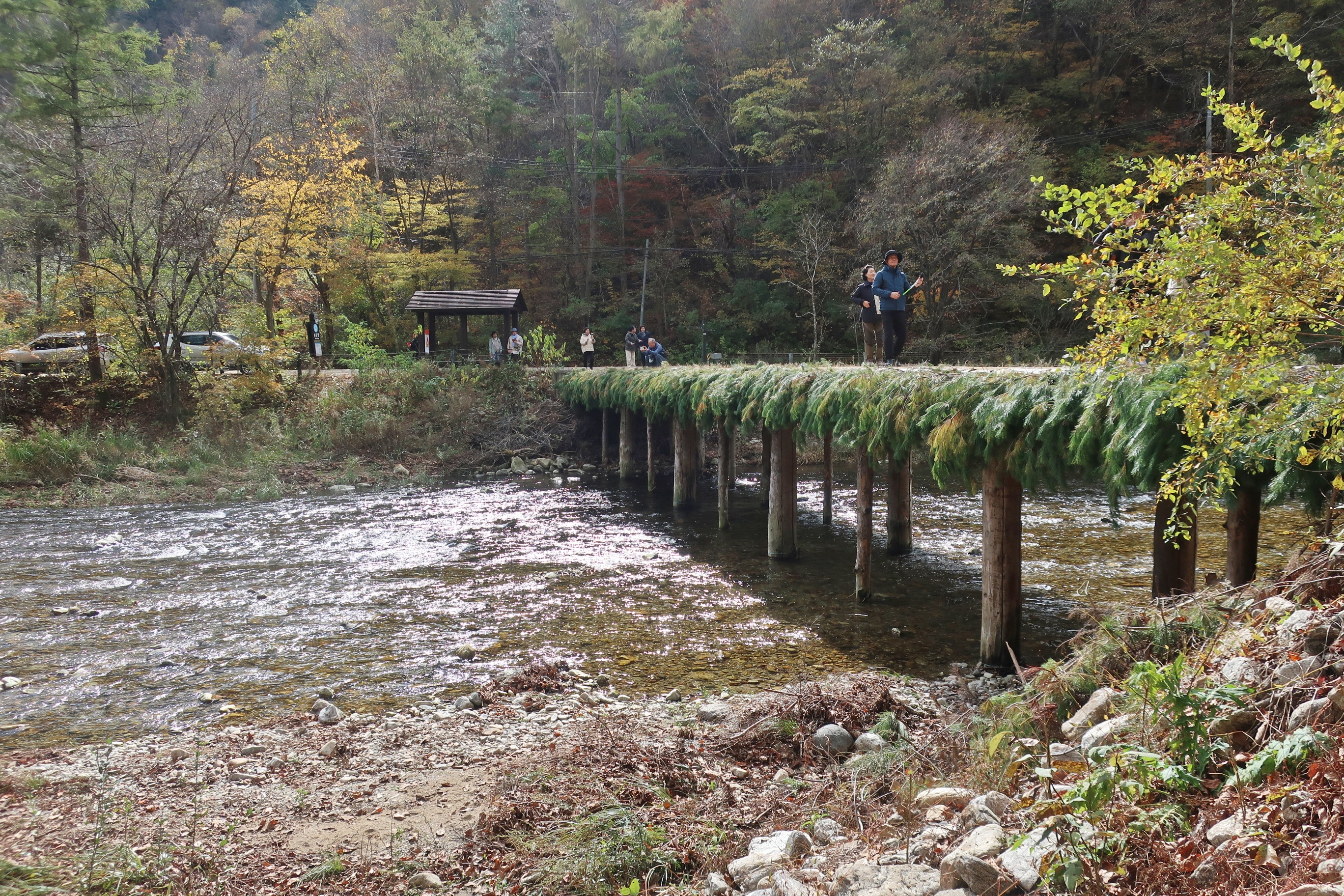 다리를 건너 오대천의 명물 섶다리를 지나간다.