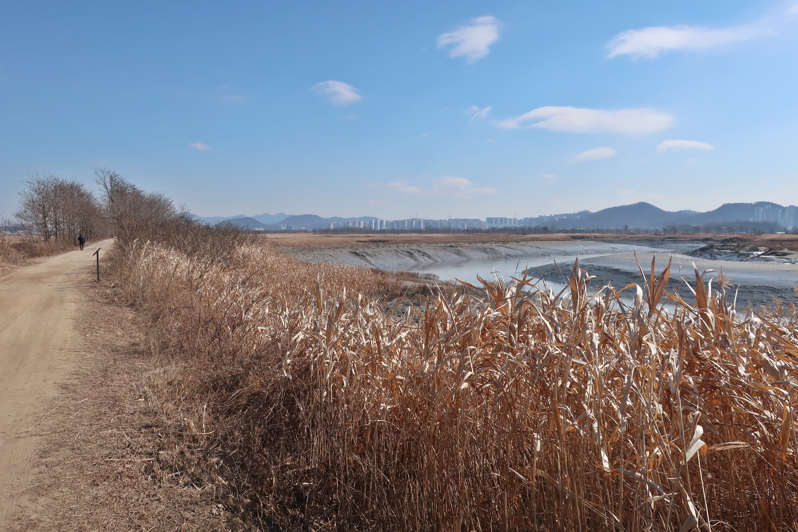 를 바라보며 자전거다리를 향해 습지 제방길을 걸어